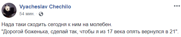"Надо таки сходить сегодня к ним на молебен. "Дорогой боженька, сделай так, чтобы я из 17 века опять вернулся в 21"", - пишет журналист Вячеслав Чечило.