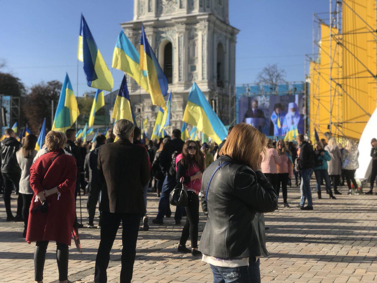 Оно началось ближе к 10 часам утра на Софийской площади. И, хотя было официально названо молебном, на деле представляло собой, скорее, политический митинг. Сначала около часа выступали президент и главы двух церквей - Киевского патриархата и УАПЦ. Они говорили о геополитике, истории, отрыве от Российской империи и прочем.