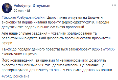 "На этой неделе ожидаем бюджетные выводы и первое чтение проекта госбюджета-2019. Народные депутаты уже подали более 2 тысяч предложений", - написал Гройсман.