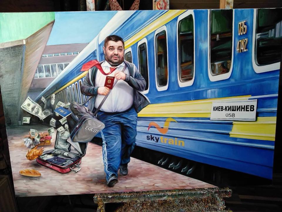 На ней запечатлен человек, похожий на нардепа от Блока Петра Порошенко Александра Грановского, и бегущий за уходящим поездом в Кишинев. Опаздывающий пассажир одет в традиционный для поезда спортивный костюм, а в руке паспорт похожий на румынский. Как следует из сюжета герой картины опаздывает на поезд Sky-Train по направлению Киев-Кишинев.
