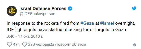 На Ближнем Востоке очередное военное обострение. Сегодня ночью, 17 октября, с территории Сектора Газа была выпущена ракета по израильскому городу Беер-Шева. В ответ на это армия Израиля подняла в воздух истребители-бомбардировщики, которые нанесли авиаудары по сектору Газа.