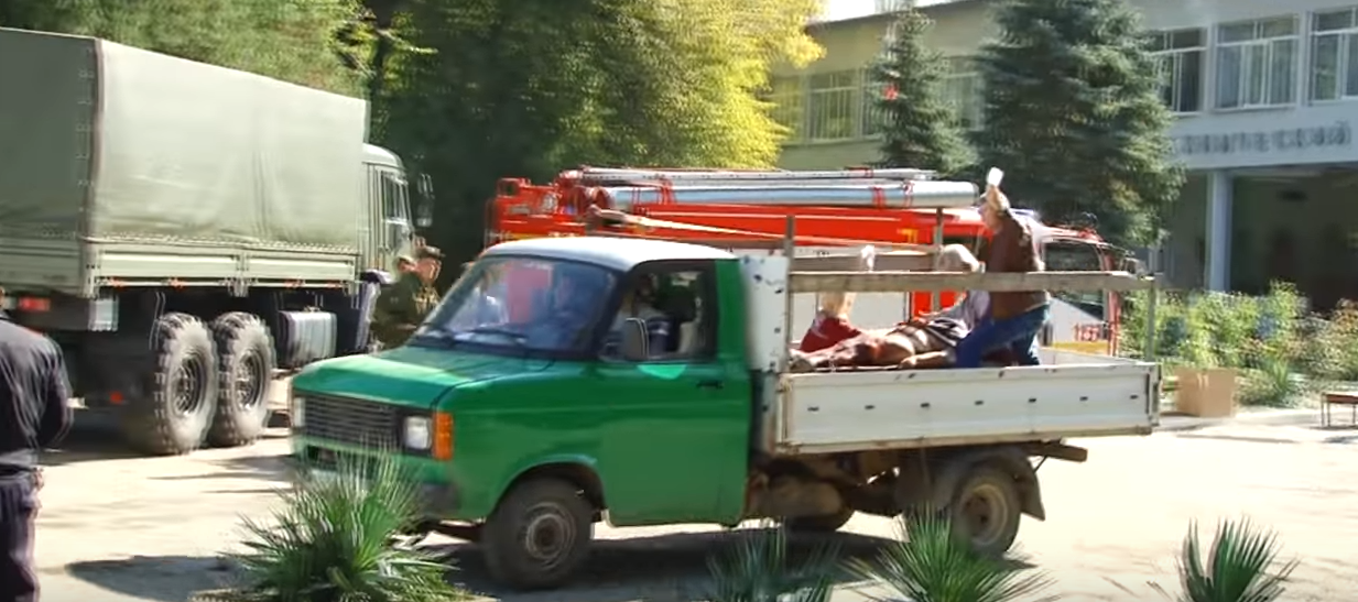 13:51  Вот так вывозят раненых из здания техникума - на обычном грузовике с открытым верхом. Капельницу держат просто в руках. Причина - нехватка "скорых".