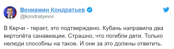 О теракте и пишет губернатор Краснодарского края Вениамин Кондратьев, которому подведомственен Крым.