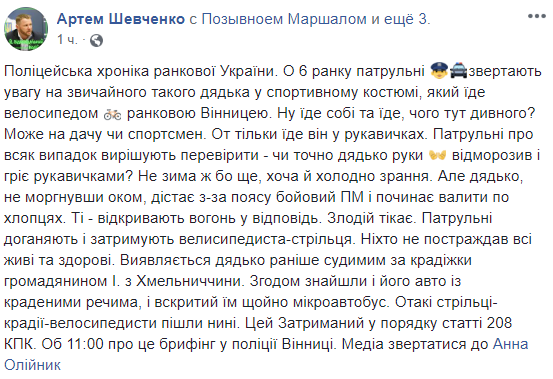 В Виннице подозрительный велосипедист в перчатках открыл стрельбу по патрульным