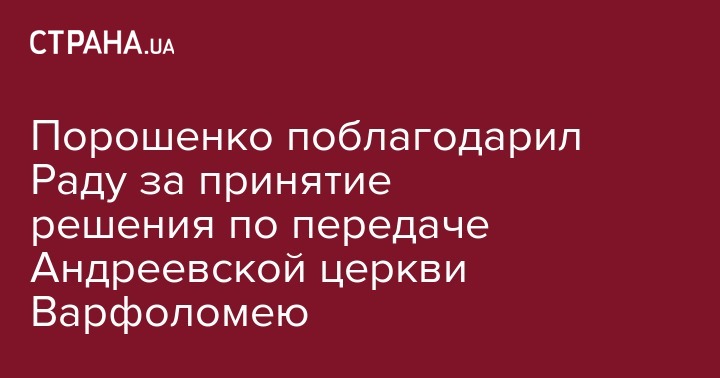 Президент Петр Порошенко поблагодарил Верховную Раду за принятие решения о передаче Андреевской церкви Константинопольскому Престолу Святого Андрея. Об этом он написал на своей странице в Facebook.
