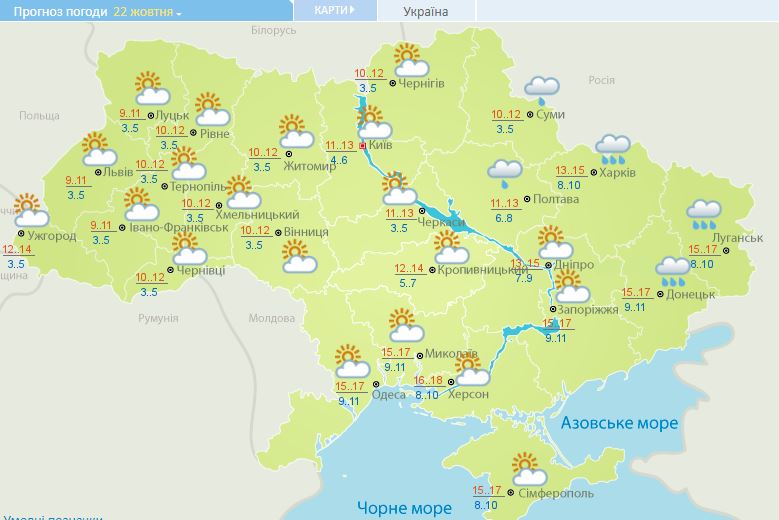 Отмечается, что 21 октября в Украине переменная облачность. На Закарпатье, Прикарпатье, днем и в восточных областях небольшой дождь, на остальной территории без осадков. Ветер преимущественно северный, 5-10 м/с. Температура ночью 3-8 градусов тепла, днем 10-15 градусов; в южных, восточных и Днепропетровской областях ночью 6-11 градусов тепла, днем 14-19 градусов.