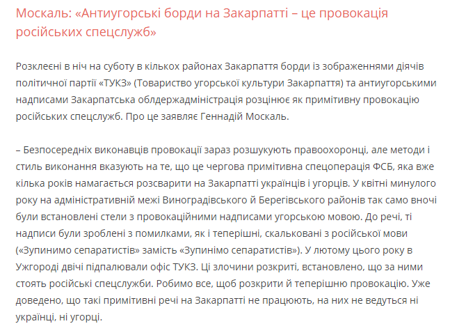 "Непосредственных исполнителей провокации сейчас разыскивают правоохранители, но методы и стиль исполнения указывают на то, что это очередная примитивная спецоперация ФСБ, которая уже несколько лет пытается рассорить на Закарпатье украинцев и венгров", - цитирует слова Москаля его пресс-служба.