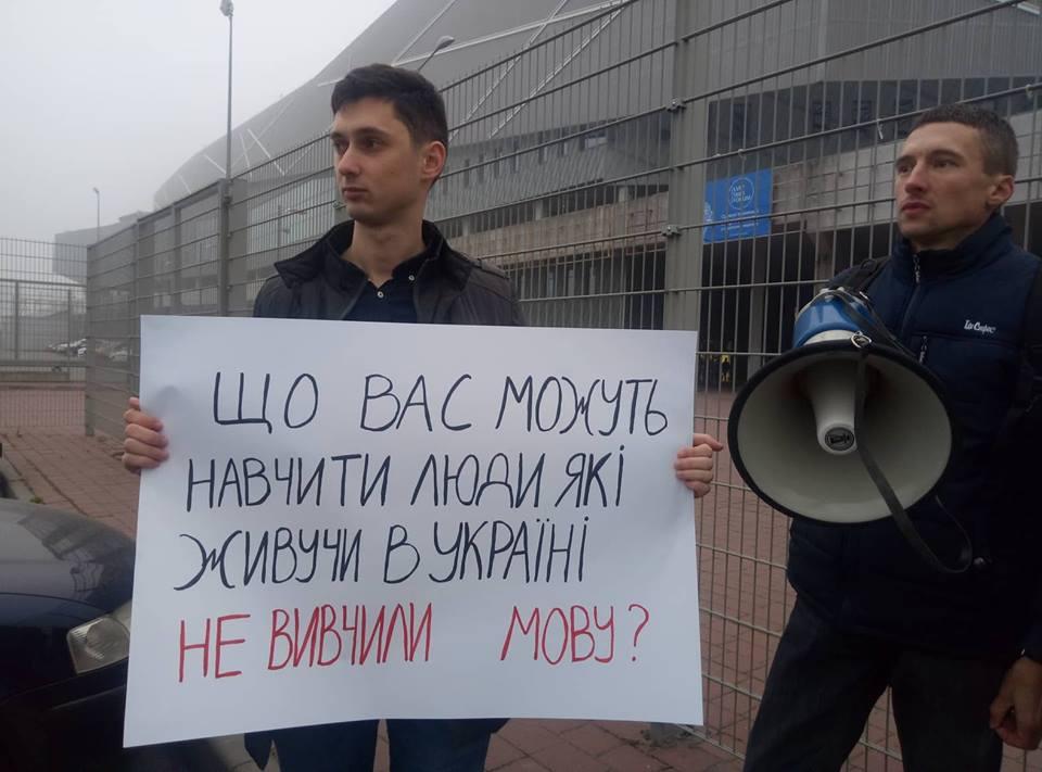 У входа на "Арену Львов" стояли около 20 человек, которые пикетировали LVIV SMM FORUM IV. Организатор акции протеста "Львоф не ґаваріт па русски!" Андрей Сывохип рассказал, что он уже не первый год добивается, чтобы выступления лекторов форуме переводили на украинский язык, однако организаторы мероприятия его постоянно игнорируют.