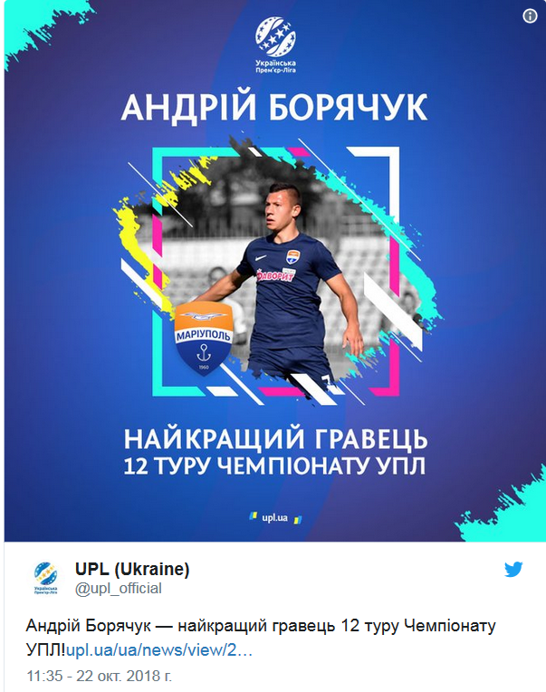 По итогам голосования победу одержал нападающий "Мариуполя" Андрей Борячук, дубль которого помог приазовцам взять три очка в игре с "Зарёй" (3 - 2). 22-летний форвард значительно опередил вингера "Александрии" Дмитрия Шастала.