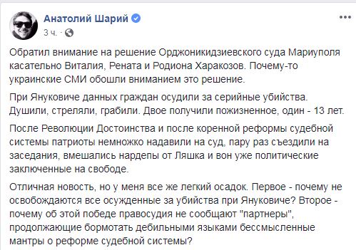 "При Януковиче данных граждан осудили за серийные убийства. Душили, стреляли, грабили. Двое получили пожизненное, один - 13 лет. После Революции Достоинства и после коренной реформы судебной системы патриоты немножко надавили на суд, пару раз съездили на заседания, вмешались нардепы от Ляшка и вон уже политические заключенные на свободе", - написал Шарий.