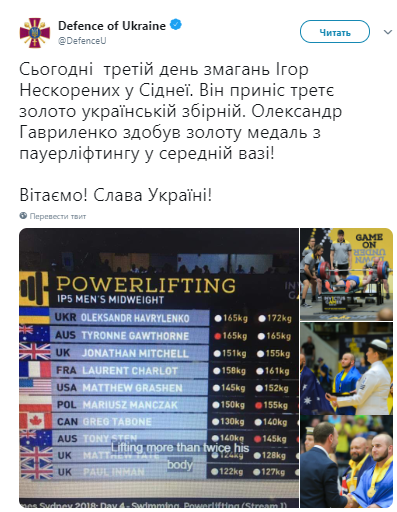 Во вторник, 23 октября, в третий день соревнований "Игры непокоренных" в Сиднее, украинская сборная положила в свою копилку третью золотую медаль. Ее завоевал украинский пауэрлифтер Александр Гавриленко. Об этом сообщает пресс-служба Министерства обороны в Facebook.