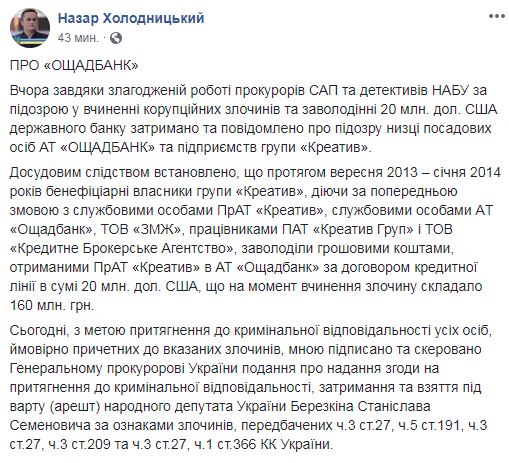 "Об "Ощадбанке"… Сегодня, с целью привлечения всех лиц, вероятно причастных к указанным преступлениям, мной подписано и направлено генеральному прокурору представление о даче согласия на привлечение к уголовной ответственности, задержание и взятие под стражу (арест) народного депутата Украины Березкина Станислава Семеновича по признакам преступлений, предусмотренных ч.3 ст.27, ч.5 ст.191, ч.3 ст.27, ч.3 ст.209 и ч.3 ст.27, ч.1 ст.366 УК Украины", - сообщил Холодницкий.
