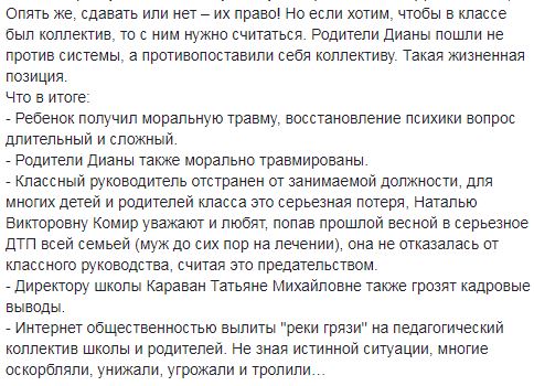 Он отмечает, что в итоге инцидента классный руководитель отстранена от должности, директору грозят оргвыводы, а "на педагогический коллектив вылиты реки грязи в интернете". "Общество, занимающееся травлей учителей - обречено! Факт ЧП - остается фактом! Все участники произошедшего обязаны задуматься и переосмыслить свою позицию. Родители одноклассников ни в коем случае не настраивать детей негативно в свете произошедшего. Родителям Дианы приношу извинения от Родительского совета школы. Проявите мудрость ради будущего наших детей!", - подытожил Мусатов.