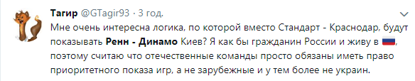 21:09 В России решили показать трансляцию матча "Динамо" - "Ренн", по сути, вместо матча "Стандарт" - "Краснодар". Нравится это, почему-то, не всем.