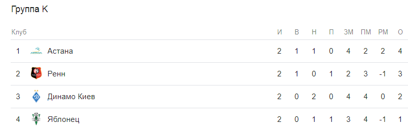 Пока в группе лидирует Астана, которая после ничьей с Динамо обыграла Ренн на своем поле - 2:0. В свою очередь Ренн в первом туре с минимальным перевесом обыграл Яблонец - 2:1 и занял второе место в группе. Динамо с двумя ничьими на третьем месте. На последнем - Яблонец.