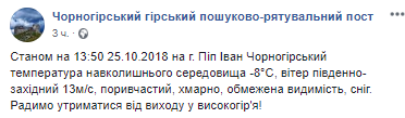 25 октября в Карпатах температура воздуха опустилась до -8 и в горах выпало много снега. Об этом сообщает Черногорский горный поисково-спасательный пост на своей странице в соцсети Facebook.