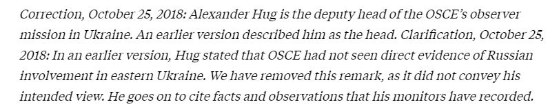 "Уточнение от 25 октября 2018 года. В более ранней версии интервью Хуг заявил, что ОБСЕ не увидела прямых доказательств вмешательства России в события на восточной Украине. Мы исключили это замечание, поскольку оно не передало его предполагаемую точку зрения. Далее он приводит факты и наблюдения, которые зафиксировали наблюдатели", - отметили в издании.
