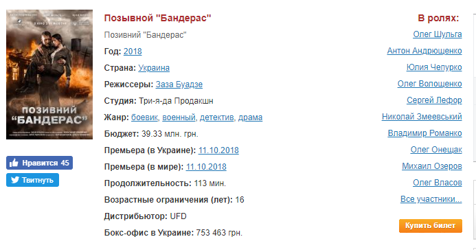Украинский фильм "Позывной Бандерас" провалился в прокате. Об этом говорят данные бокс-офиса, размещенные на сайте "Кино-театр.ua".