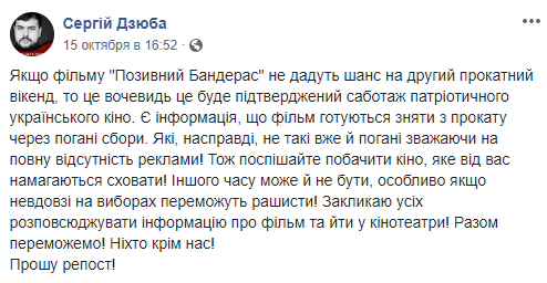 "Если фильму "Позывной Бандерас" не дадут шанс на второй прокатный уикенд, то это очевидно это будет подтверждением саботажа патриотического украинского кино. Есть информация, что фильм готовятся снять с проката из-за плохих сборы. Которые на самом деле не так уж плохи ввиду полного отсутствия рекламы! Поэтому спешите увидеть кино, которое от вас пытаются скрыть! Другого времени может и не быть, особенно если вскоре на выборах победят рашисты!" - сказано в сообщении.