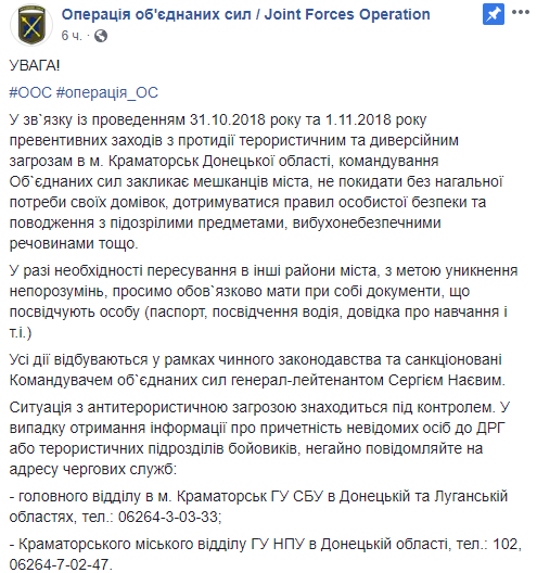 В Краматорске 31 октября и 1 ноября силовики проведут превентивные мероприятия по противодействию террористическим и диверсионным группам. Жителей просят оставаться дома, не паниковать, а при возможности - иметь при себе паспорт. Об этом сообщает пресс-центр штаба ООС в Facebook.