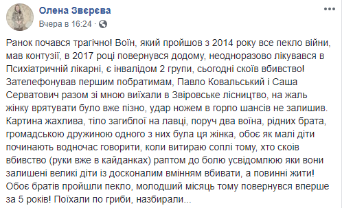 "Он неоднократно лечился в психиатрической больнице, является инвалидом 2 группы, совершил убийство! Позвонил первым побратимам. Павел Ковальский и Саша Серватович вместе со мной выехали в Зверовское лесничество. К сожалению, женщину спасти было уже поздно - удар ножом в горло шансов не оставил", - написала она.