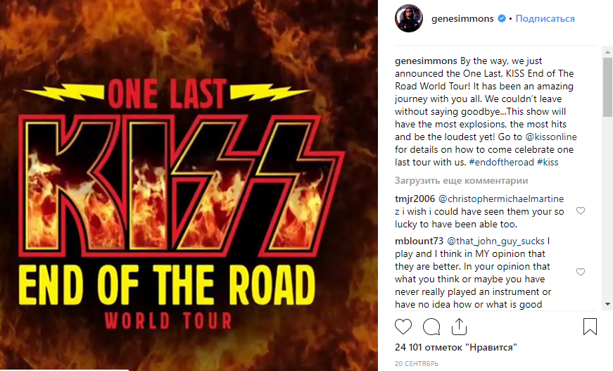 Напомним, еще в сентябре этого года музыканты анонсировали прощальное турне в эфире финального выпуска шоу America's Got Talent. Фронтмен группы Джин Симмонс также написал на своей странице в Instagram о том, что они не могут уйти не сказав "до свидания". По словам Симмонса, прощальное шоу будет "самым взрывным, самым хитовым и самым громким".