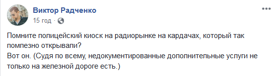 "Помните полицейский киоск на радиорынке на Кардачах, который так помпезно открывали? Вот он. (Судя по всему, недокументированные дополнительные услуги не только на железной дороге есть)", - написал Виктор Радченко.