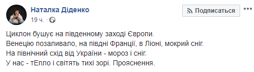 Из-за циклона, который бушует в северо-западной части Европы, во Франции выпал снег, а в Венеции - наводнение. Об этом сообщила синоптик Наталья Диденко на своей странице в Facebook.