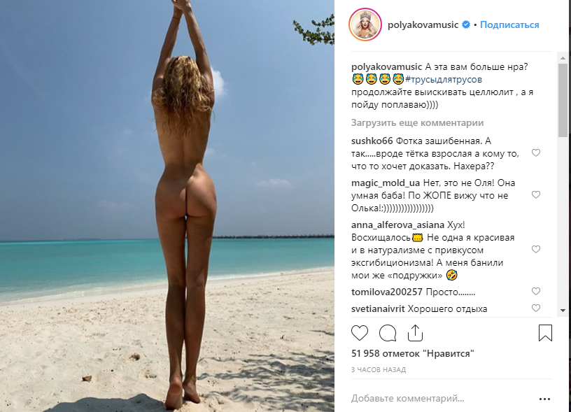 Пикантные фото с одного из пляжей на Мальдтвах певица подписала так: "#трусыдлятрусов доброе утро!".  Другое фото увеличено. Оля написала, чтобы пользователи продолжали искать целлюлит, а она пойдет поплавает.