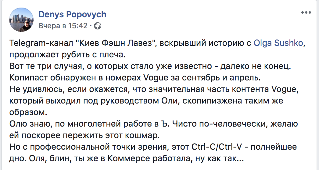 "Не удивлюсь, если окажется, что значительная часть контента Vogue, который выходил под руководством Оли, скопи...жена таким же образом. Олю знаю по многолетней работе в Ъ. Чисто по-человечески, желаю ей поскорее пережить этот кошмар. Но с профессиональной точки зрения, этот Ctrl-C/Ctrl-V – полнейшее дно. Оля, блин, ты же в Коммерсе работала, ну как так", – пишет журналист Денис Попович.