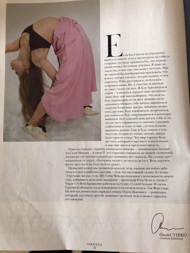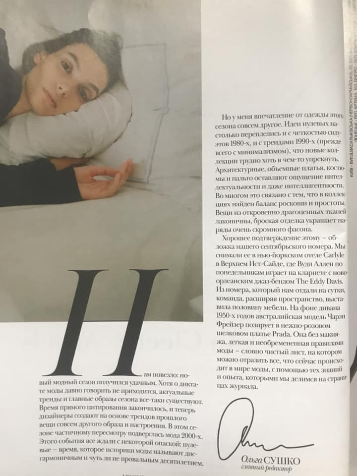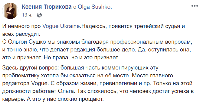 "И немного про Vogue Ukraine.Надеюсь, появится третейский судья и всех рассудит. С Ольгой Сушко мы знакомы благодаря профессиональным вопросам, и точно знаю, что делает редакция большое дело. Да, оступилась она, это и признает. Неправа, но и это признает.