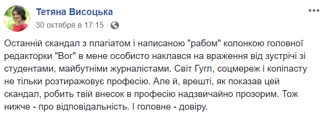 "Последний скандал с плагиатом и написанной "рабом" колонкой главного редактора "Вог" у меня лично наложился на впечатления от встречи со студентами, будущими журналистами. Мир Google, соцсетей и копипаста не только растиражирует профессию. Но и, наконец, как показал этот скандал, делает твой вклад в профессию чрезвычайно прозрачным. Поэтому ниже – об ответственности. И главное – доверии", – пишет журналистка Татьяна Высоцкая.