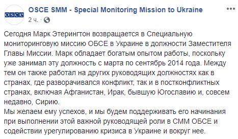 "Сегодня Марк Этерингтон возвращается в Специальную мониторинговую миссию ОБСЕ в Украине в должности заместителя главы миссии. Марк обладает богатым опытом работы, поскольку уже занимал эту должность с марта по сентябрь 2014 года", - сказано в сообщении СММ ОБСЕ на странице в соцсети Facebook в четверг.