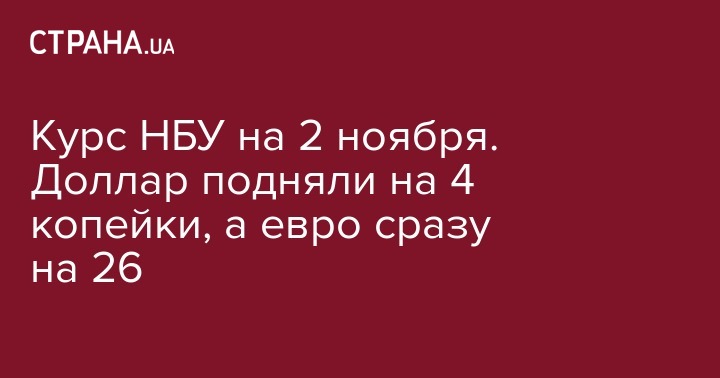 Также НБУ повысил курс евро к гривне на 26 копеек до 32,08 гривень за евро. Об этом свидетельствуют данные на сайте регулятора. Официальный курс евро на 2 ноября установлен на уровне 3208,0253 гривни за 100 евро (+25,5359 грн).