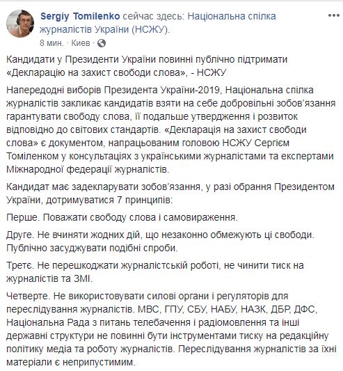 Он пишет, что Декларацию разработали в НСЖУ при участии украинских журналистов и экспертов Международной федерации журналистов. Согласно сообщению, кандидат в президенты должен задекларировать обязательства, а в случае избрания президентом соблюдать 7 принципов: