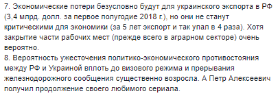7. Экономические потери безусловно будут для украинского экспорта в РФ (3,4 млрд. долл. за первое полугодие 2018 г.), но они не станут критическими для экономики (за 5 лет экспорт и так упал в 4 раза). Хотя закрытие части рабочих мест (прежде всего в аграрном секторе) очень вероятно.