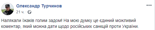 Секретарь СНБО Александр Турчинов был краток: "Напугали ежей голым задом! По моему мнению это единственный возможный комментарий, который можно дать в отношении российских санкций против Украины".