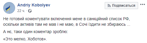 Глава правления "Нафтогаз" Андрей Коболев, который как известно, хранит деньги не в России, а в США у мамы, процитировал фразу из комедии "Покровские ворота": "Не готов комментировать включения меня в санкционный список РФ, поскольку активов там не было и нет, в Сочи ездить не собираюсь ... А нет, таки один комментарий сделаю: "Это мелко, Хоботов".