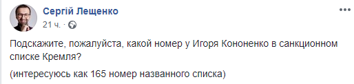 Депутат от БПП Сергей Лещенко заметил, что в списке нет Игоря Кононенко, которого называют соратником Петра Порошенко. "Подскажите, пожалуйста, какой номер у Игоря Кононенко в санкционном списке Кремля?(интересуюсь как 165 номер названного списка)".