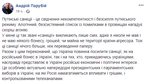 Спикер Верховной Рады Андрей Парубий заявил, что у него санкции вызывают лишь смех. "Путинские санкции - это свидетельство некомпетентности и бессилия путниского режима. Алогичный, бессистемный список с ошибками в фамилиях напоминает скорее агонию.