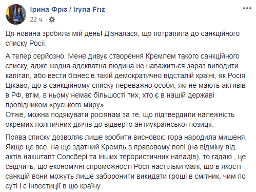"Эта новость сделала мой день! Узнала, что попала в санкционный список России. А теперь серьезно. Меня удивляет создания Кремлем такого санкционного списка, ведь ни один адекватный человек не решится сейчас выводить капитал, или вести бизнес в такой демократически отсталой стране, как Россия. Интересно, что в санкционный список в основном лица, не имеющие активов в РФ, впрочем, в нем нет большинства тех, кто в нашем государстве проводником "русского мира".