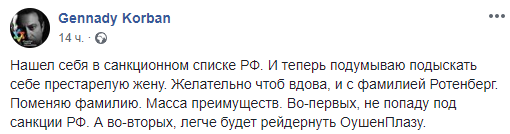 Экс-глава партии Укроп Геннадий Корбан также нашел себя в санкционном списке: "Нашел себя в санкционном списке РФ. И теперь подумываю подыскать себе престарелую жену. Желательно чтоб вдова, и с фамилией Ротенберг. Поменяю фамилию. Масса преимуществ. Во-первых, не попаду под санкции РФ. А во-вторых, легче будет рейдернуть ОушенПлазу".