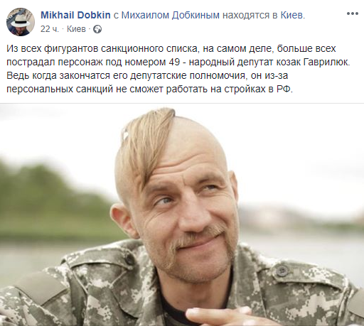 Нардеп от Оппоблока Михаил Добкин написал, что из всех фигурантов списка больше всех пострадал депутат Михаил Гаврилюк. "Из всех фигурантов санкционного списка, на самом деле, больше всех пострадал персонаж под номером 49 - народный депутат козак Гаврилюк. Ведь когда закончатся его депутатские полномочия, он из-за персональных санкций не сможет работать на стройках в РФ".