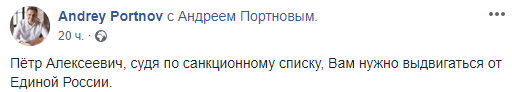 Юрист Андрей Портнов отметил, что в кремлевском списке не оказалось президента. "Пётр Алексеевич, судя по санкционному списку, Вам нужно выдвигаться от Единой России".
