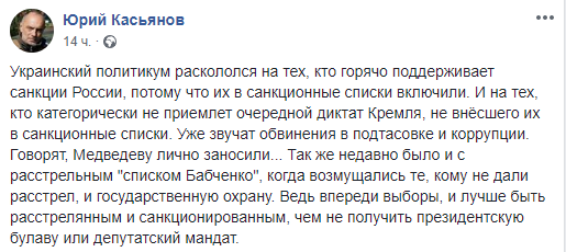 Волонтер Юрий Касьянов написал, что санкции раскололи украинский политикум. "Украинский политикум раскололся на тех, кто горячо поддерживает санкции России, потому что их в санкционные списки включили. И на тех, кто категорически не приемлет очередной диктат Кремля, не внёсшего их в санкционные списки. Уже звучат обвинения в подтасовке и коррупции. Говорят, Медведеву лично заносили... Так же недавно было и с расстрельным "списком Бабченко", когда возмущались те, кому не дали расстрел, и государственную охрану. Ведь впереди выборы, и лучше быть расстрелянным и санкционированным, чем не получить президентскую булаву или депутатский мандат".