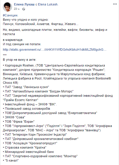 Юрист Елена Лукаш перечислила активы, связанные с Петром Порошенко, которые не попали в "список Кремля". "Вижу что угодно и кого угодно: Пинчук, Коломойский, Ахметов, Фирташ, Жеваго... Но, видимо, шоколадные плитки, желейки, вафли, бисквиты, зефир и пастила в мармеладе. И под санкции не попали".