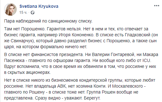 Заместитель редактора "Страны" Светлана Крюкова поделилась парой наблюдений по санкциям. "Пара наблюдений по санкционному списку. Там нет Порошенко. Гарантов нельзя. Нет в нем и тех, кто отвечает за бизнес гаранта, например Игоря Кононенко. В списке есть Гладковский (он же Свинарчук), который давно разделил бизнес с Порошенко, а также сын царя, на котором формально ничего нет.