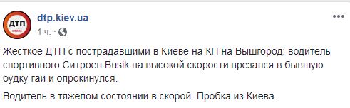 "Жесткое ДТП с пострадавшими в Киеве на КП на Вышгород: водитель спортивного Сitroen Busik на высокой скорости врезался в бывшую будку ГАИ и опрокинулся", - говорится в нем. Водителя в тяжелом состоянии госпитализировали. На улице Богатырской на выезде из Киева образовалась пробка.