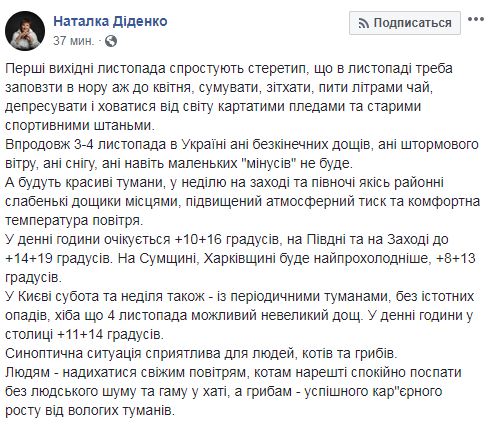 "На протяжении 3-4 ноября в Украине ни бесконечных дождей, ни штормового ветра, ни снега, ни даже маленьких "минусов" не будет. А будут красивые туманы, в воскресенье на западе и севере какие-то районные слабенькие дождики местами, повышенное атмосферное давление и комфортная температура воздуха", - отмечает синоптик.