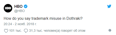 "Нам не было известно об этом сообщении, и мы бы предпочли, чтобы наш товарный знак не присваивали бы в политических целях", - говорится в комментарии телеканала. Кроме того, в твиттер HBO появилась запись: "Как бы вы сказали "неправомерное использование товарного знака" на дотракийском?" (Дотракийский - вымышленный язык, используемый в сериале, - Прим.Ред).